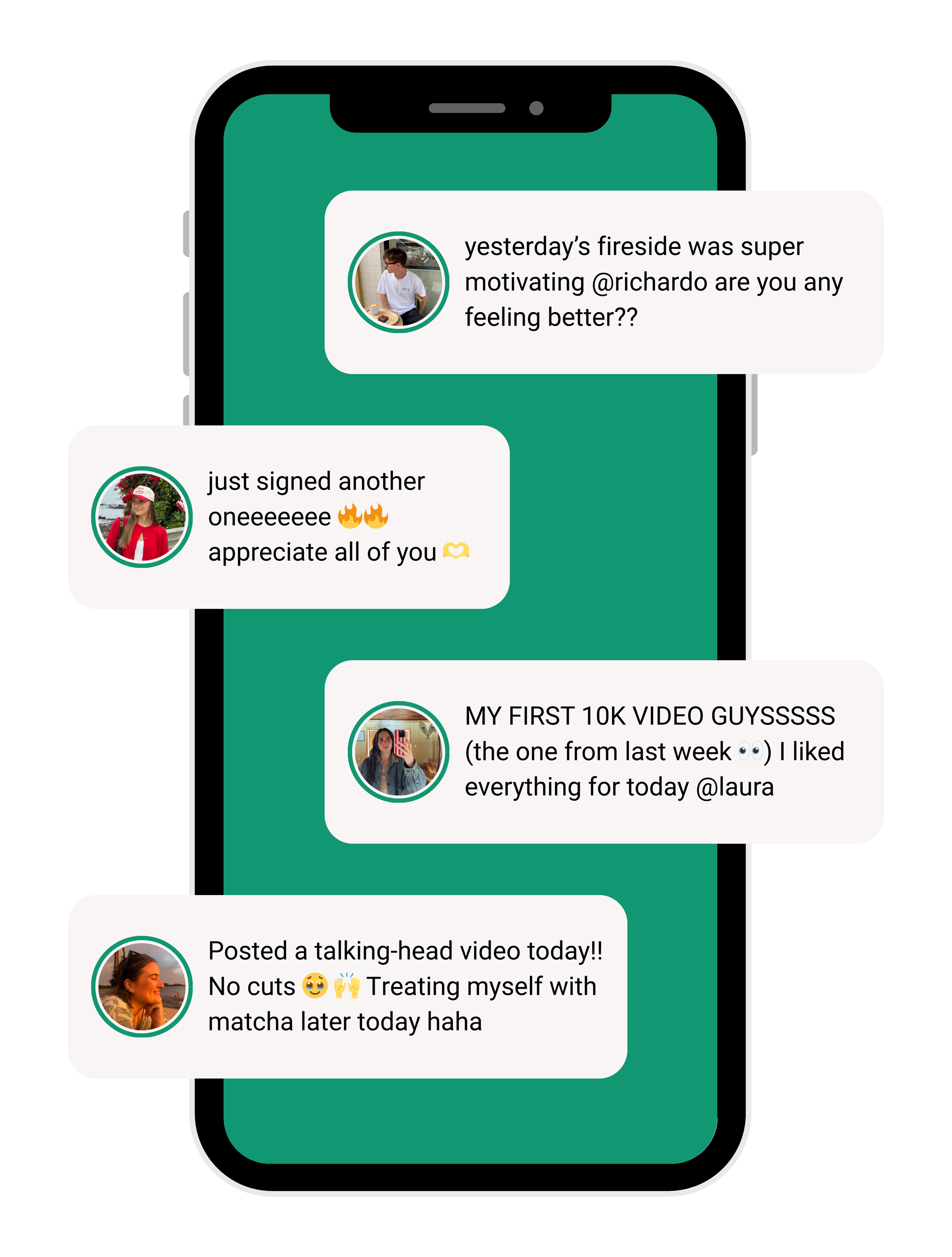 Our creator cohorts are little private communities built just for early-stage creators who want to escape isolation and be surrounded by like-minded people. Join a driven group that supports each other with genuine engagement (get likes + comments) and weekly fireside chats to connect and discuss mindset. If you're feeling stuck or lonely as an early-stage creator, joining a cohort will build the momentum you need to succeed.